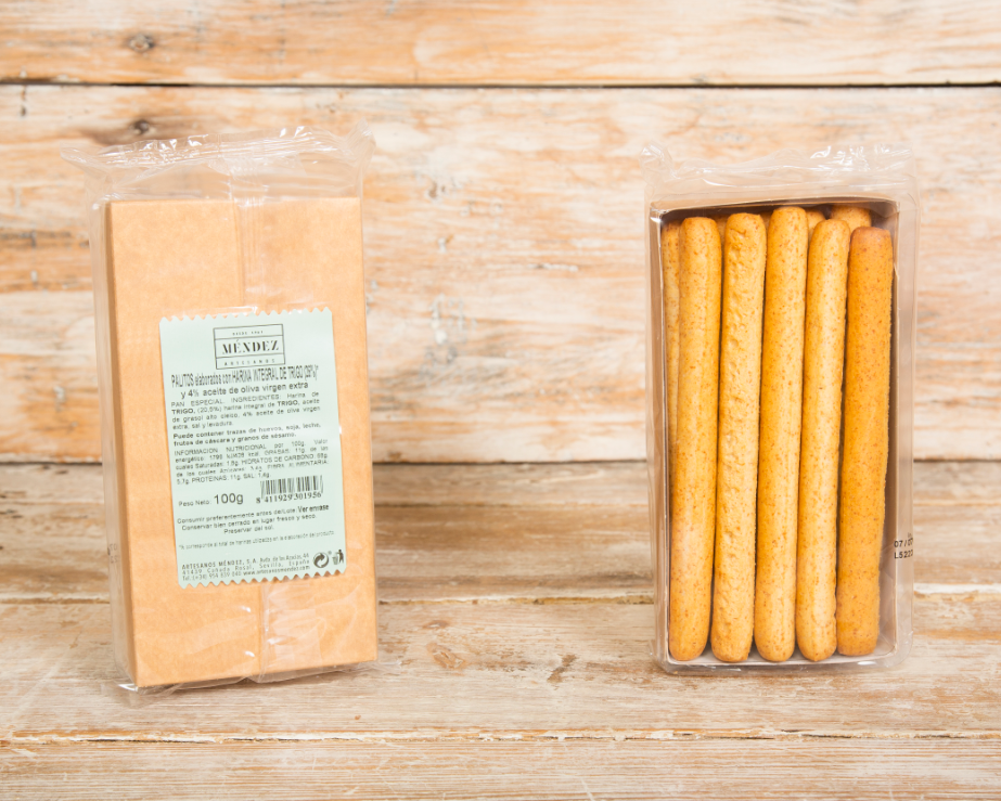 Descubre nuestros Palitos Integrales  con 4,5% Aceite de Oliva de 100g, una delicia crujiente y nutritiva.